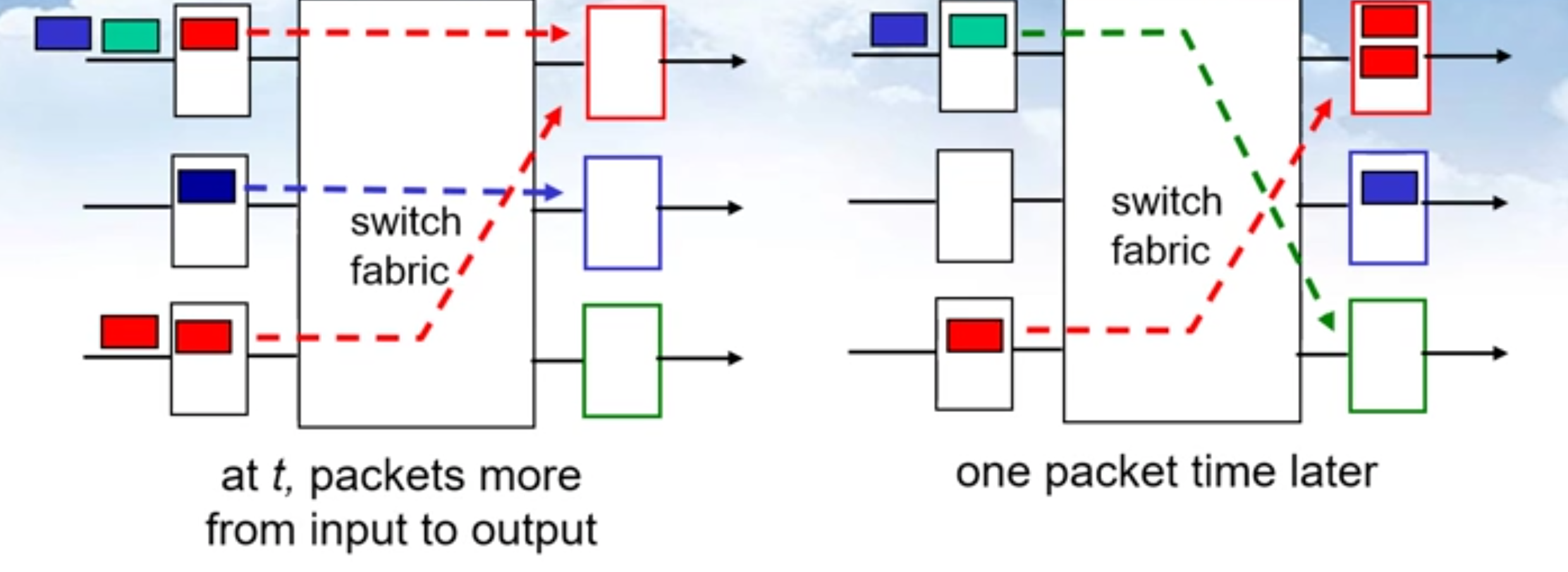 - 출력 포트가 결정되면 스위치 구조에 전달되지만, 임시적 블로킹 가능 -> 큐잉은 입력 큐에서 발생할 수 있음