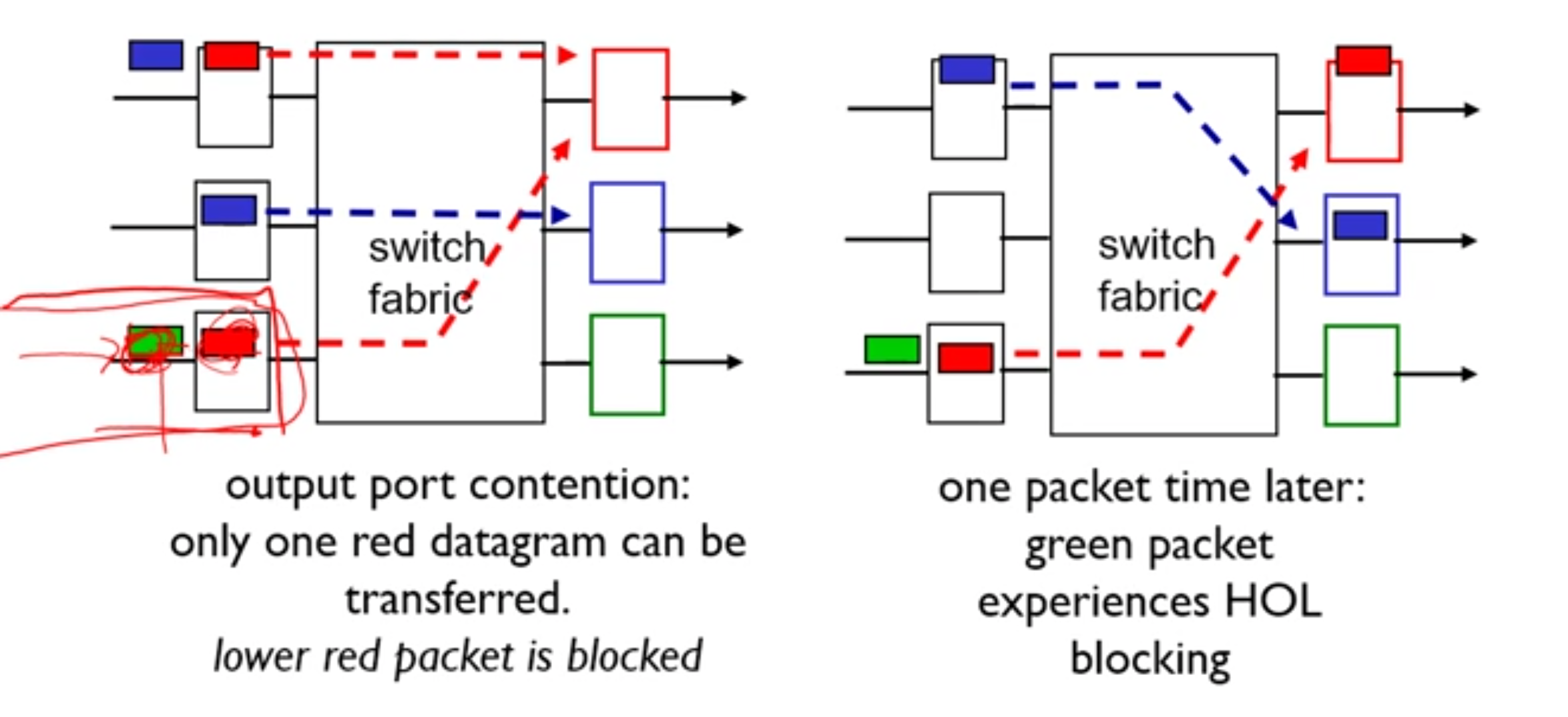 - Head-of-the-Line(HOL) blocking : 큐의 앞쪽에 큐된 데이터그램은 큐에서 다른 데이터그램들이 전달되는 것 방해