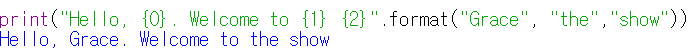 C언어를 아시는 분이면 쉽게 이해할 것입니다. 문자열 포맷팅을 하는 것입니다. {0} {1} {2} 순서대로 format 안에 있는 것을 print에 있는 {0} {1} {2}에 넣는 것입니다.