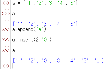 리스트 추가 삽입 append() 리스트 마지막에 요소 새로 추가 , insert() 해당 위치에 요소 삽입