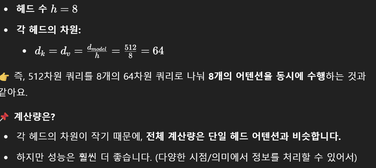 - 이 h개의 출력을 이어붙인 뒤(concatenate) 다시 선형 변환하여 최종 출력 생성